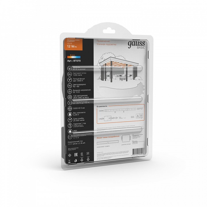 гибкая влагостойкая светодиодная лента 5 м в блистере:, герметичная силиконовая оболочка, предназначена для использования на улице, клейкое основание с защитной пленкой, цвет основания: белый, тип светодиодов: SMD2835, размер светодиодов: 2.8х3.5 мм, модуль резки: 50 мм, наименьший радиус изгиба: 25мм при выборе блока питания следует учитывать общую мощность ленты или нескольких лент, соединенных вместе, с добавлением 10-20 % запаса по мощности |