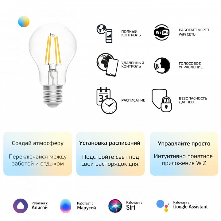 Беспроводное соединение:, протокол беспроводного соединения Wi-Fi 2,4 ГГц, растояние беспроводного соединения до 20 м Управление:, управление через приложение, управление Wi-Fi пультом, количество режимов освещения по умолчанию - 14,создание дополнительных режимов освещения, , голосовое управление |