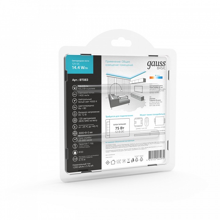 гибкая светодиодная лента 3 м в блистере:, клейкое основание с защитной пленкой, цвет основания: белый, тип светодиодов: SMD2835, размер светодиодов: 2.8х3.5 мм, модуль резки: 50 мм, при выборе блока питания следует учитывать общую мощность ленты или нескольких лент, соединенных вместе, с добавлением 10-20 % запаса по мощности |